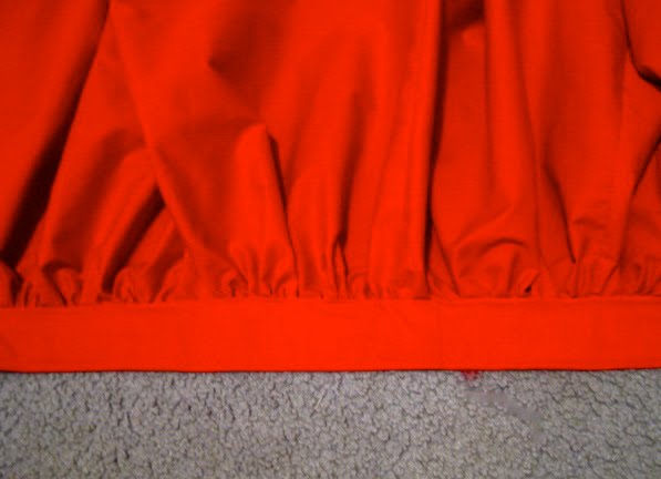 Step 7: Gather the skirt, and pin each end to the place inside the waistband where the interfacing ends. Note that the waistband should be like a little 'pocket', with one side open. The gathered skirt will be pinned INSIDE this little 'pocket', so no raw edges will be showing.